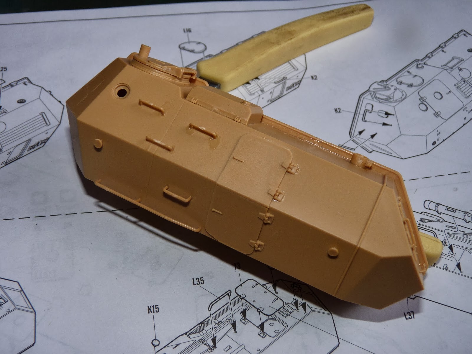At this point, I have put on all the grab handles, almost all the doors and tools. I still have to put on the hatch and the many little P.E hooks.